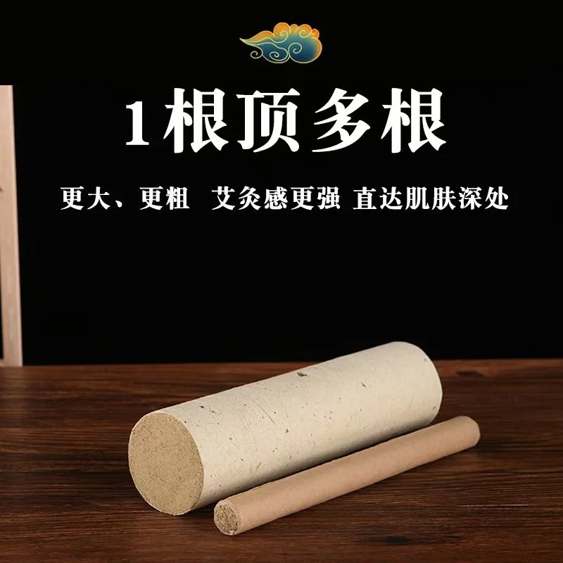陈年艾绒悉心炮制,紧实卷条,形体粗壮,直径达7厘米,炙感温和,艾灸面积大,燃烧时间久